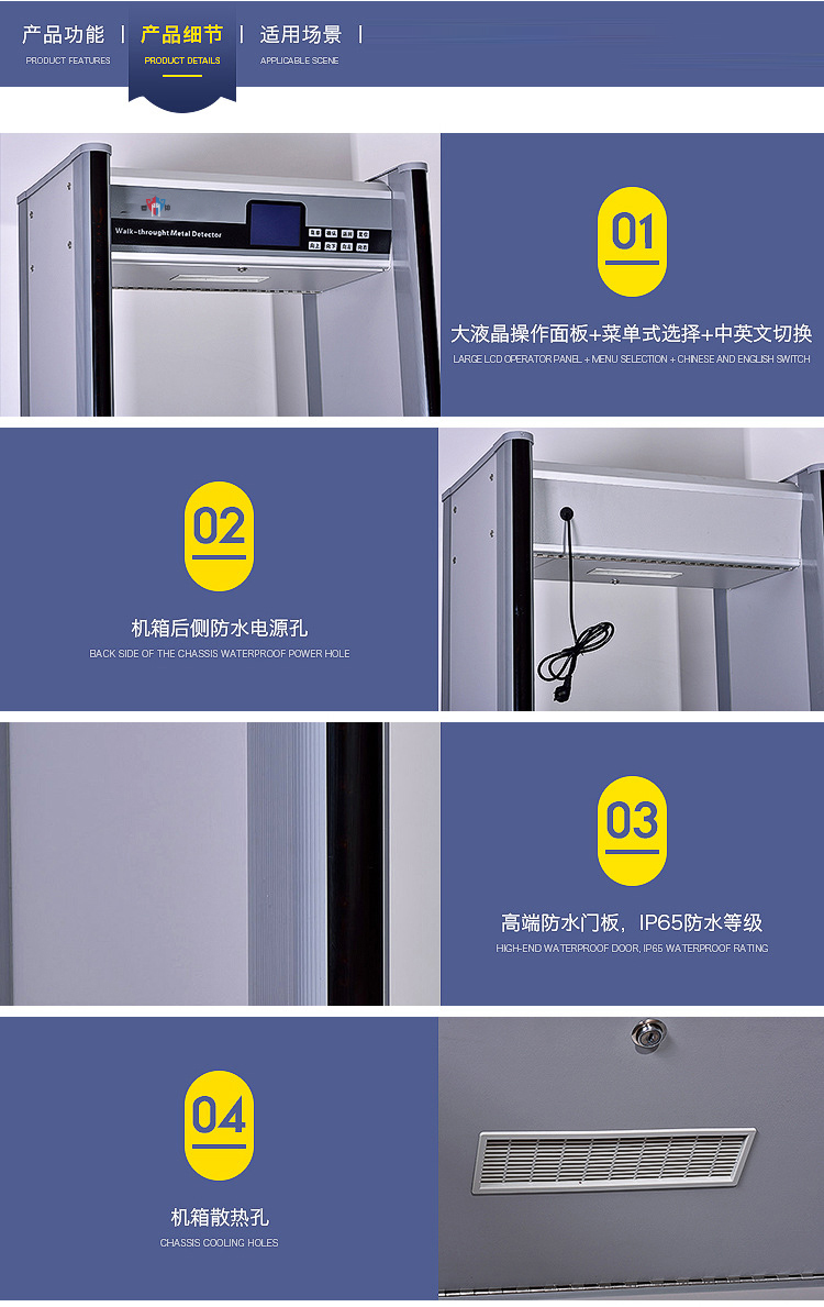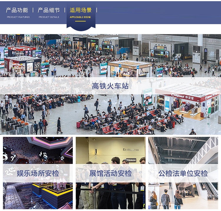 KMS-600Q 安檢門采用電磁兼容設計和抗震動設計,具有高靈敏度、強抗干擾能力和強抗震能力,適用于管制刀具和槍支等危險物品的安全檢查,廣泛應用于監獄、法院、學校、醫院、電子企業、港口、客運站、展覽會館、會議中心、重大慶典、演唱會等重要場所。
