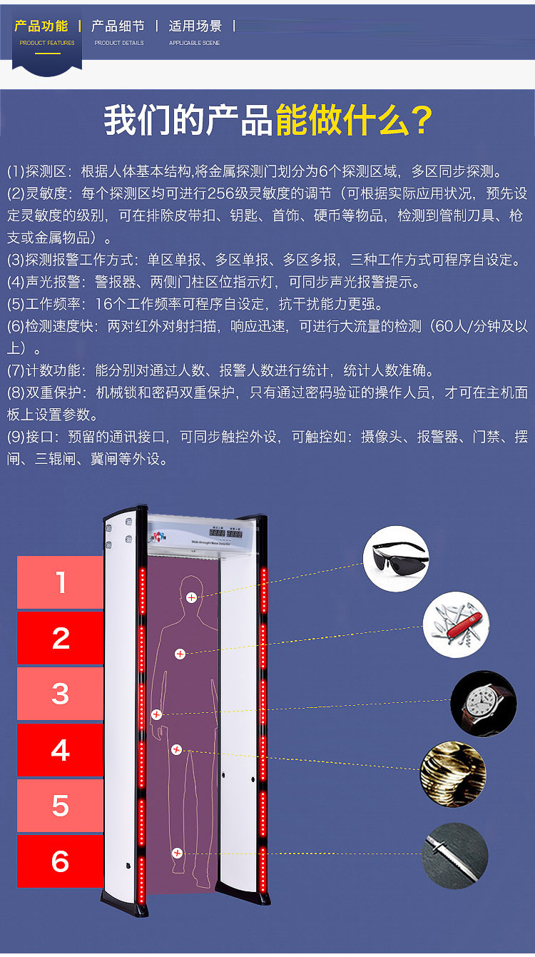 (1)、探測區:根據人體基本結構,將金屬探測門劃分為6個探測區域,多區同步探測。